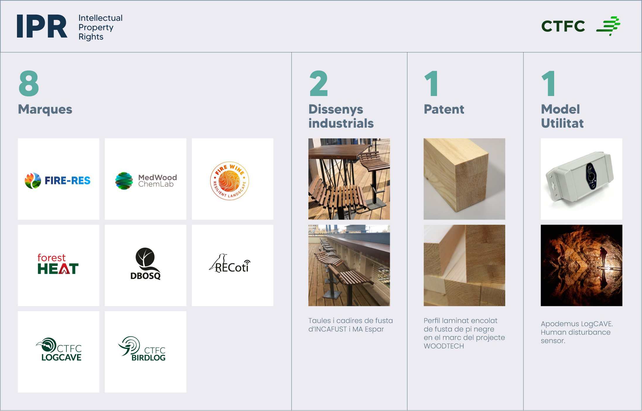 El CTFC treballa per promoure els drets de propietat intel·lectual. Aquest concepte inclou les patents, els drets d’autor, les marques comercials, els dissenys industrials, les indicacions geogràfiques, els secrets comercials i les noves varietats vegetals.