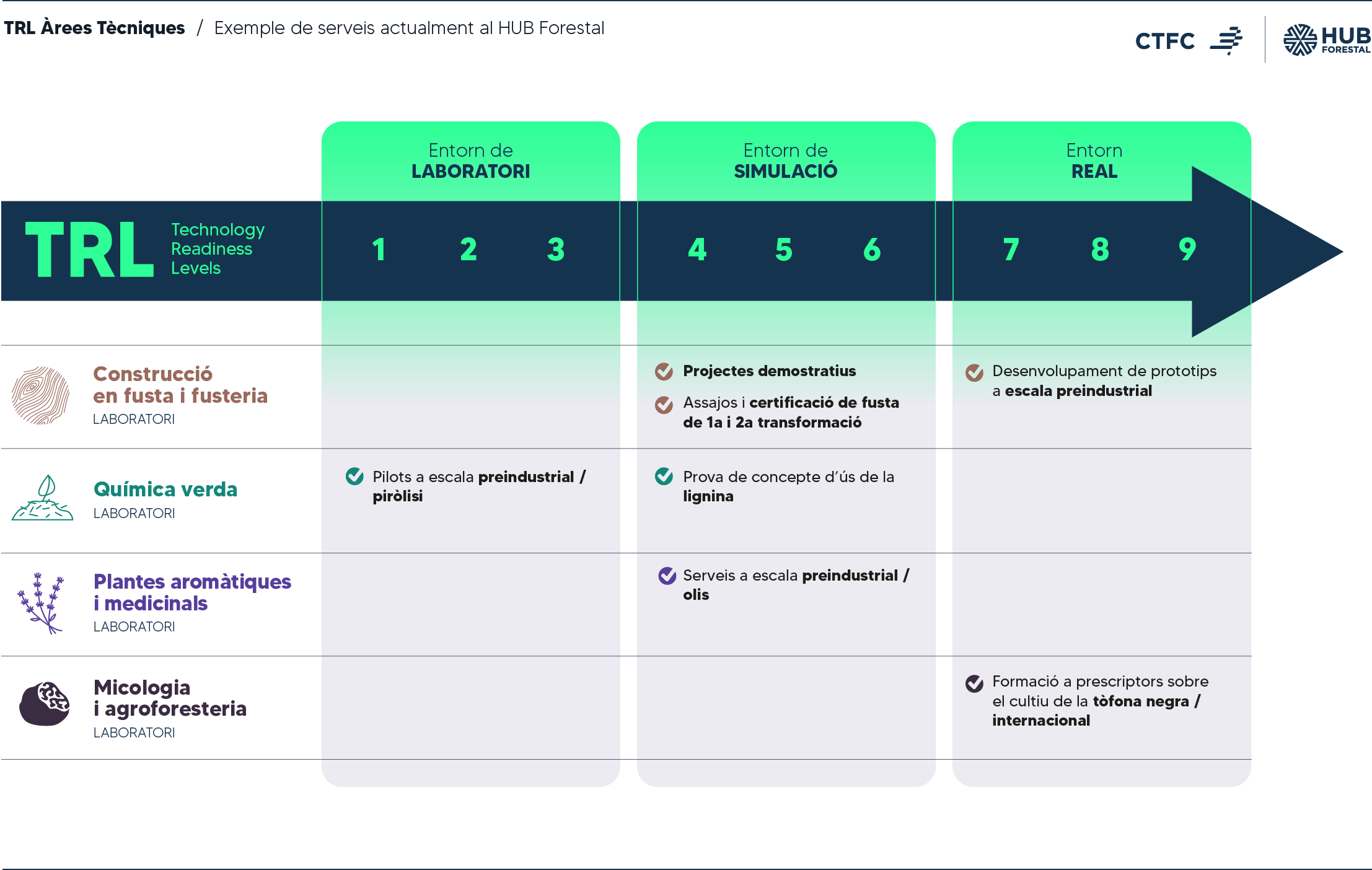 Aquí presentem exemples de cadenes de valor del HUB Forestal en diferents nivells de maduresa tecnològica (Technology Readiness Levels, TRL), o etapes de desenvolupament tecnològic.